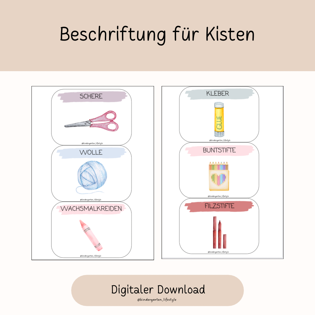 Mit diesem Material können Kisten/ Boxen ganz einfach gekennzeichnet werden. Somit sehen Kinder, wo welche Gegenstände sind bzw. hingehören.
