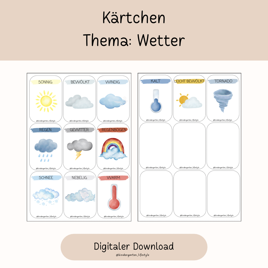 - Wetterkarten: Enthält Karten zu unterschiedlichen Wetterarten wie sonnig, bewölkt, windig, regen, Gewitter, Regenbogen, Schnee, Nebel, warm, kalt, leicht bewölkt und Tornado.