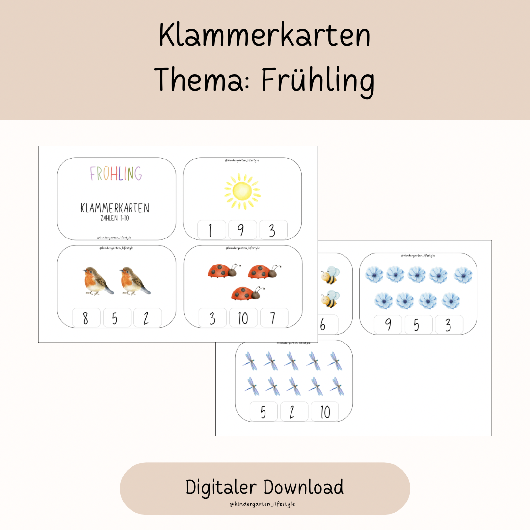 - Klammerkarten: Karten mit Abbildungen und Zahlenoptionen darunter. Die Kinder klammern die richtige Anzahl mit einer Wäscheklammer.