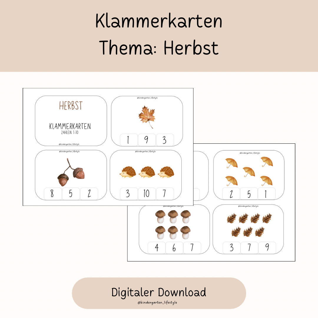- Klammerkarten: Karten mit Abbildungen und Zahlenoptionen darunter. Die Kinder klammern die richtige Anzahl mit einer Wäscheklammer.