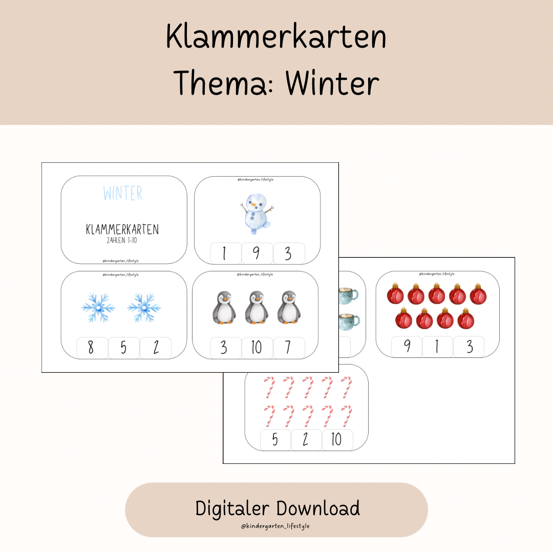 - Klammerkarten: Karten mit Abbildungen und Zahlenoptionen darunter. Die Kinder klammern die richtige Anzahl mit einer Wäscheklammer.