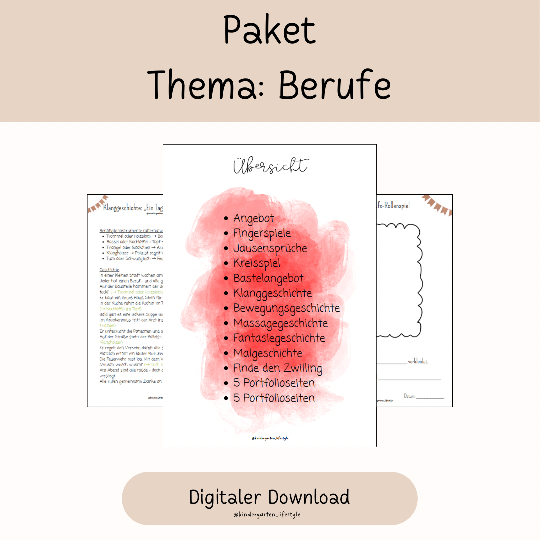 Mit unserem „Paket Berufe“ tauchen Kinder spielerisch in die spannende Welt verschiedener Berufe ein. Ob Arzt, Feuerwehrmann, Bäcker oder Polizist – das Paket enthält liebevoll gestaltete Materialien, mit denen Kinder Berufe kennenlernen, spielerisch üben und ihre Fantasie entfalten können.