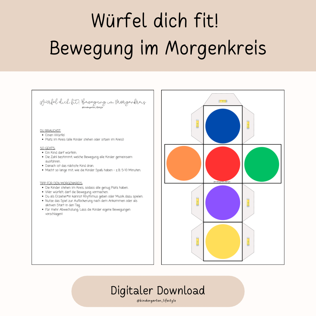 Mit diesem Material bringst du Bewegung und Spaß in den Morgenkreis! Die Kinder würfeln und führen gemeinsam die Bewegungen aus, die der Würfel vorgibt. So starten alle aktiv in den Tag und fördern gleichzeitig ihre motorischen Fähigkeiten.